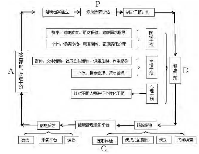 “4C”是指健康管理的 4 個環(huán)節(jié),包括: (1) 社區(qū)診斷和健康檔案建立; (2) 健康風(fēng)險評估; (3) 社區(qū)健康風(fēng)險干預(yù);(4) 健康干預(yù)和效果評價。