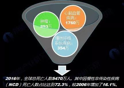 根據(jù)2016全球疾病負(fù)擔(dān)研究(Global Burdenof Disease Study 2016,GBD)公布的數(shù)據(jù)顯示,2016年全球總死亡人數(shù)為5470萬人,其中死于慢性非傳染性疾病(NCD)人數(shù)占比達(dá)到72.3%,總?cè)藬?shù)為4004萬人。2016年慢性非傳染性疾病(NCD)死亡人數(shù)較2006年增加了16.1%。 2016年,造成最多死亡人數(shù)的三類死因?yàn)椋盒哪X血管疾病-1760萬;腫瘤-893萬;慢性呼吸系統(tǒng)疾病-354萬。
