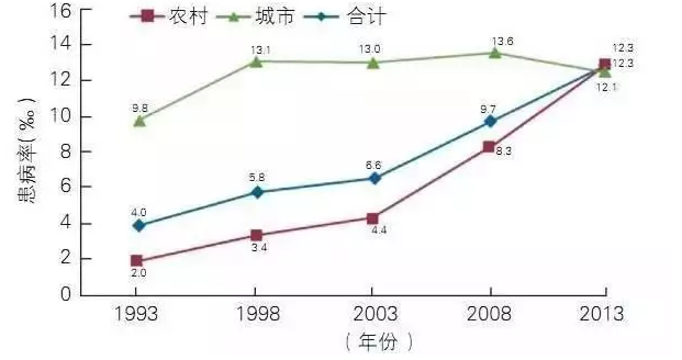 2017年6月,《中國心血管病報告2016》發(fā)布,報告概要刊登于中國循環(huán)雜志。國家衛(wèi)生服務(wù)調(diào)查結(jié)果顯示,1993~2013年期間,我國腦血管病患病率整體呈上升趨勢,以前是城市高于農(nóng)村,但目前已經(jīng)發(fā)生逆轉(zhuǎn)。2013年的第五次調(diào)查顯示,城市腦血管病患病率(12.1‰)有所下降,農(nóng)村(12.3‰)仍呈明顯的上升。腦卒中現(xiàn)患人數(shù)約1300萬,腦卒中給中國造成的經(jīng)濟負擔(dān)每年高達400億元。