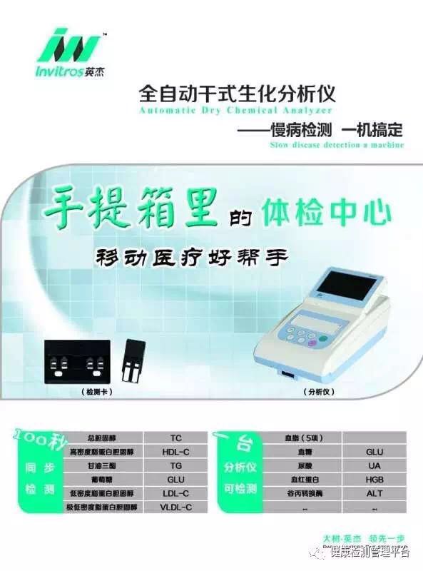 南京大樹(shù)英杰——全自動(dòng)干式生化分析儀,100秒同步檢測(cè)總膽固醇、高密度脂蛋白膽固醇、甘油三酯、葡萄糖、低密度脂蛋白膽固醇、極低密度脂蛋白膽固醇,尿酸,血紅蛋白和谷丙轉(zhuǎn)氨酶。手提箱里的體檢中心,移動(dòng)醫(yī)療好幫手。!
